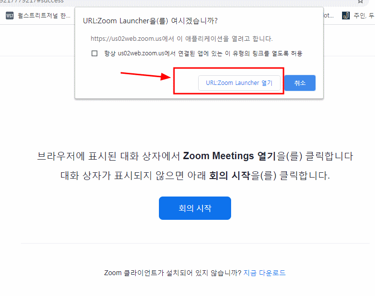 위 빨간색 테두리로 된 곳에 URL을 클릭 합니다. 혹시나 클릭을 했는데 아무런 동작이 되지 않는다면 아래 회의 시작이라는 파란색 버튼을 클릭 합니다.