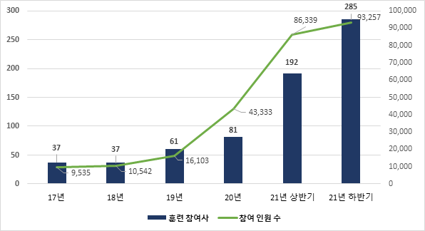 ㅇ 하반기 훈련 규모는 ’21년 상반기(192개사, 86,339명)와 비교 시 참여기업은 48.4% 증가, 참가 임직원은 8% 증가하였으며, ’20년 평균(81개사, 43,333명) 대비해서도 기업 및 인원이 각 3.5배, 2.1배 이상 증가하여, 기업들이 사이버 위협에 인식과 대응능력 향상에 관심이 높아지고 있음을 알 수 있었다.