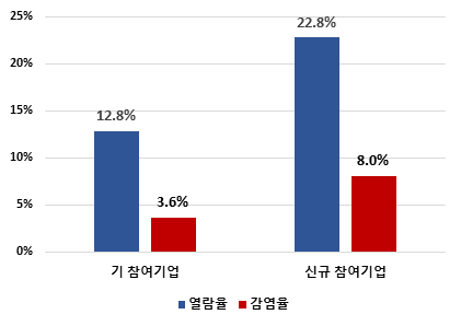 - 또한, 재참여기업의 감염율은 3.6%로 신규참여기업의 감염률(8.0%)에 비해 45% 낮게 나타났음