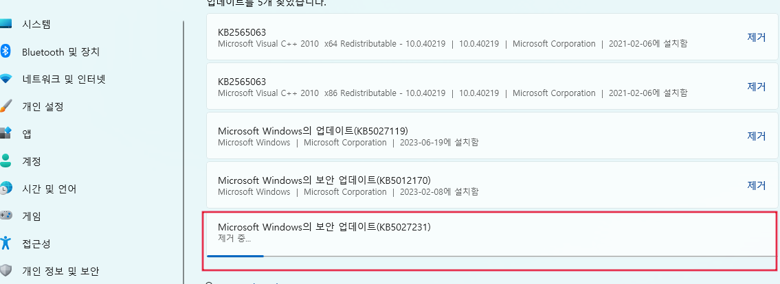 제어판 > 프로그램 및 기능 > 설치된 업데이트 보기 > 보안 업데이트 KB5027231 제거 > 재부팅
