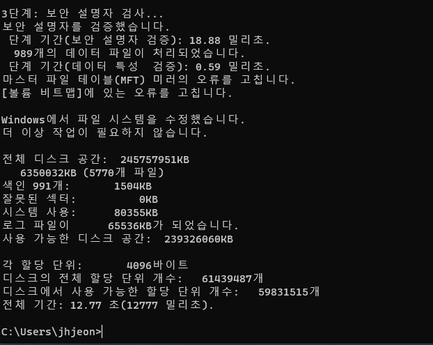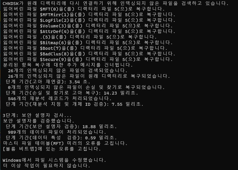 복구가 안되면 결국 자료는 포기하고 다른 일부터 하려고 했는데 파일이 모두 복구가 되었습니다. 파일에도 액세스가 잘되고 기존에 있던 파일도 모두 접근이 되었습니다.
