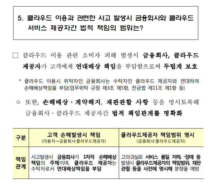 클라우드 이용과 관련한 사고 발생시 금융회사와 클라우드서비스 제공자간 법적 책임의 범위는?