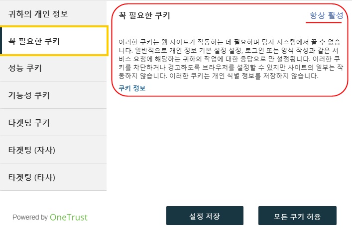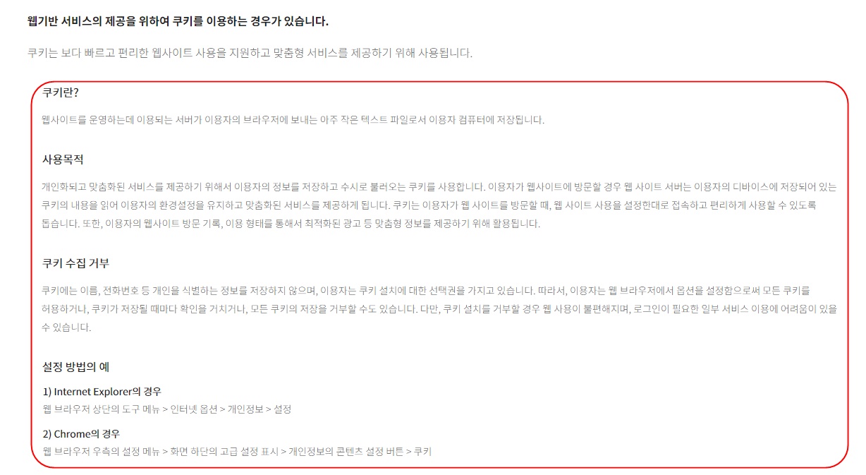 한국은 개인정보처리방침에 다음 몇줄만 업로드 해 놓고 , 이를 정보주체나 이용자에게 쿠키 정보에 대한 선택적 결정을 하는 것이라고는 느껴지지 않는다.