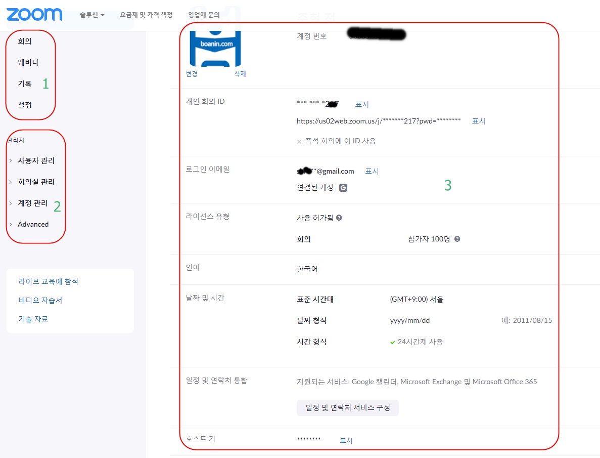 줌을 로그인 하게 되면 아래 그림과 같이 3개의 파트로 보여집니다. 참고적으로 필자의 버전은 유료 버전이며 시간이 지날때 마다 줌측에서 업그레이드 해 각 메뉴의 위치가 조금씩 버전에 따라
