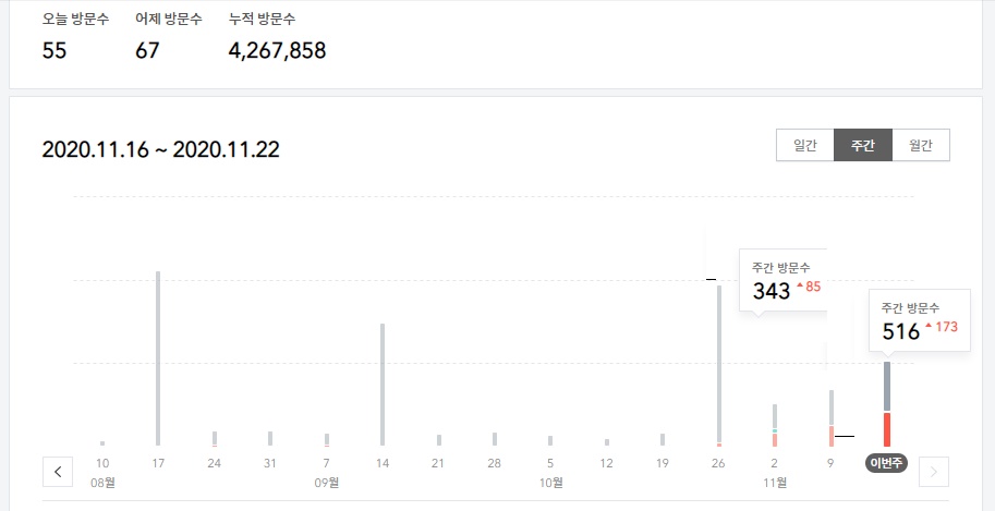 현재는 새로 포스팅 한 글이 몇개 되지 않아 두자리 수에 머물고 있습니다. 과거 한창 블로그 포스팅 할때 비하면 방문자 수가 형편 없지만 꾸준히 성실하게 진실성 있는 글을 쓰게 되고, 콘텐츠 수가 쌓이면 불가능한 목표치도 아니라는 것을 알기에 다시 꾸준히 해 보고자 합니다.